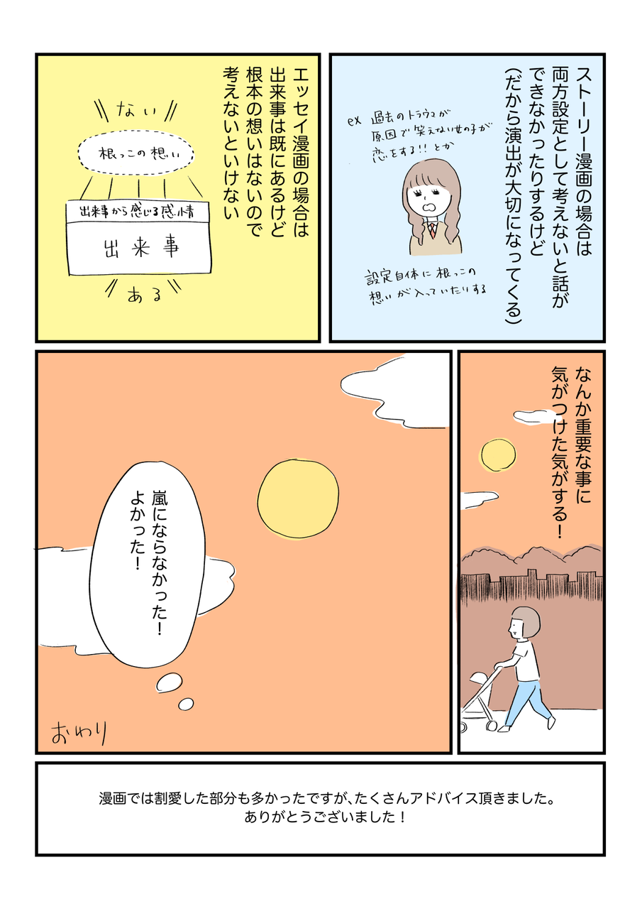 エッセイ漫画持ち込みルポ!その2 2021年08月07日 その1からの続きになります。終わりです。持ち込むと大きな学び気付きになりますね!漫画たくさん描いて精進したいと思います!!漫画シリーズ色々読めます〜日常漫画もくじイギリス留学まんがもくじ 「[短編]シリーズ漫画」カテゴリの最新記事 タグ :#漫画#持ち込み#エッセイ漫画#育児 < 前の記事次の記事 > コメント コメントフォーム 名前 コメント 評価する リセット リセット 顔 星 投稿する 情報を記憶